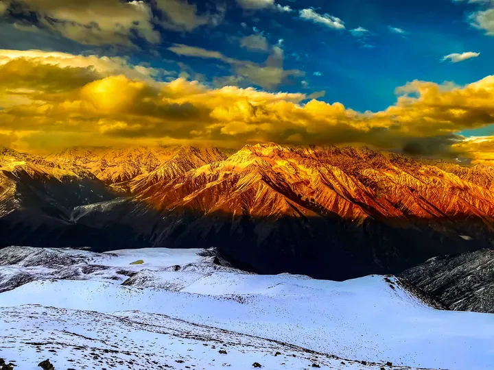 站在子梅垭口,欣赏贡嘎山群峰在夕阳余晖中的美景,贡嘎夕阳,日照金山。