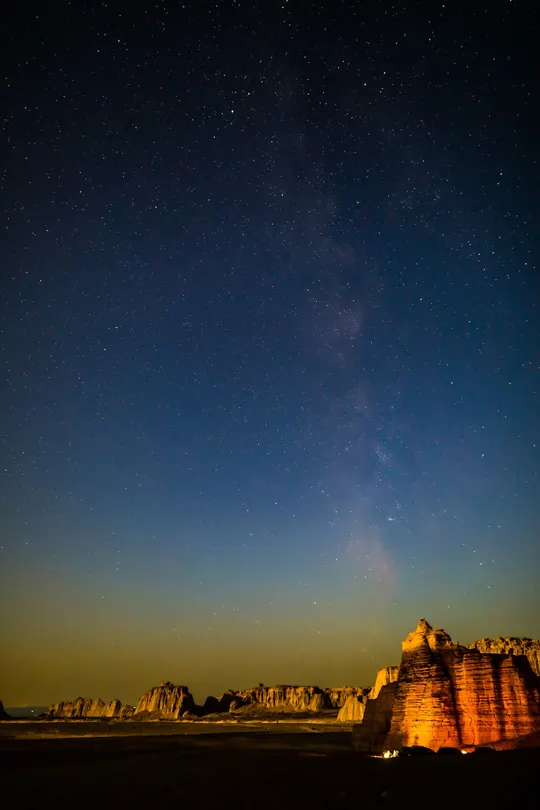 夕阳西下几时回,月儿东升梦星辰。海道沧桑千韧山,大漠戈壁万般情。夜宿大海道无人区,月夜星辰。