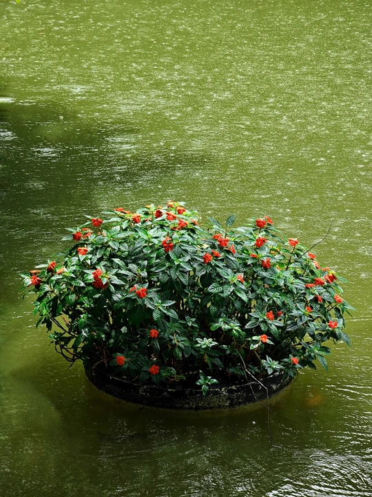 夏日急雨如粒粒珠子落入湖中,泛起无数小水花,此时的花儿格外鲜艳,有活力。