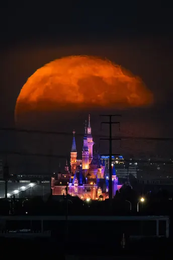 我在直线距离迪士尼10km的50米楼顶,拍摄到了近0仰角的极限超级悬月。当一轮巨大的月亮从地平线升起,划过迪士尼城堡上时,这就是科学摄影的极致浪漫。