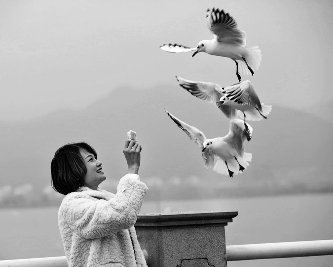 这张照片在多项摄影技巧上表现出色。首先,构图上使用了三分法,将女孩与飞鸟放置在视觉重心上,使图片布局平衡且富有张力。其次,黑白色调的运用强调了光影的对比,使主要元素更加突出。女孩多余光影对比,使画面显得干净而简洁。摄影师还巧妙利用了前景和背景的关系,远处模糊的山峦增加了画面的层次感,同时不会分散观者的注意力。后期处理方面,黑白色调增强了情感的表达,使照片更具艺术性。 观者可以明显感受到照片中的生动和愉悦气氛,女孩的笑容与飞鸟的动态形成了互动,为画面增添了活力。这种情感共鸣是照片的亮点之一。同时,这张照片也能引发人们对人与自然和谐共处的思考,具有一定的深度。 改进方面,可以考虑增加对细节的处理。例如,画面的清晰度和对焦点可以进一步优化,使飞鸟的羽毛纹理更加细腻可见。此外,若能在后期处理中进一步增强光影对比,使画面的层次更加分明,会使照片更具视觉冲击力。整体而言,这是一张充满情感且技术过硬的作品,但仍有微小之处可以进一步提升。