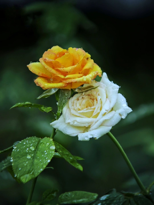 雨后,两朵月季花依偎在一起,画面温馨惬意。