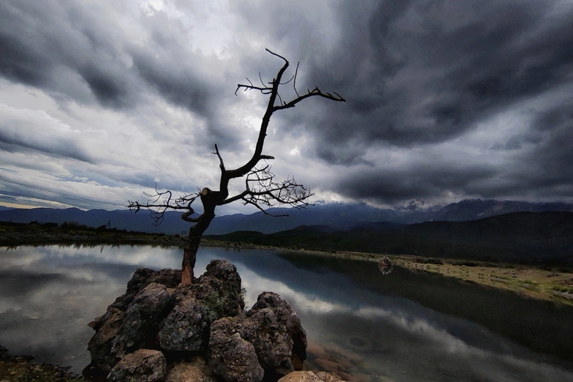 孤树映山湖,天空乌云密,暴风雨将至,寂静如画卷。