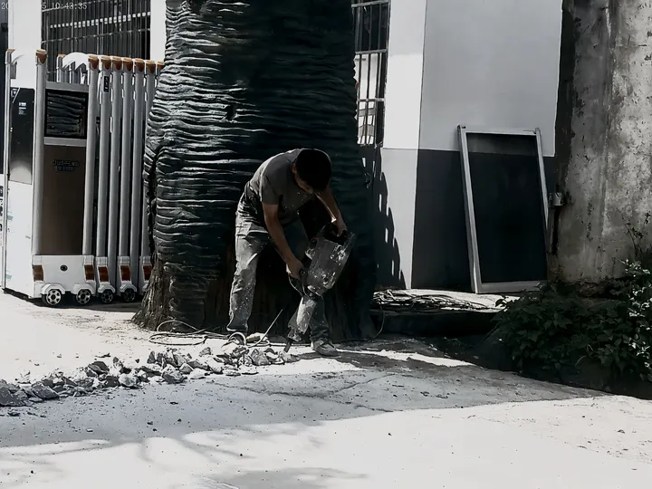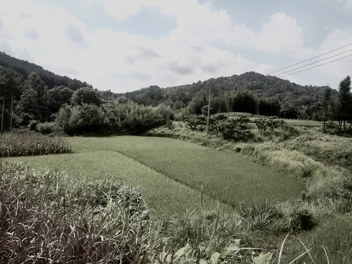 乡村的画卷中,稻田随风摇曳,弯曲的小公路绵延远方。此刻,有人专注地用工具钻地,一旁,被一群树叶环抱的破房子,静立在时光的角落。