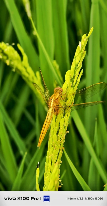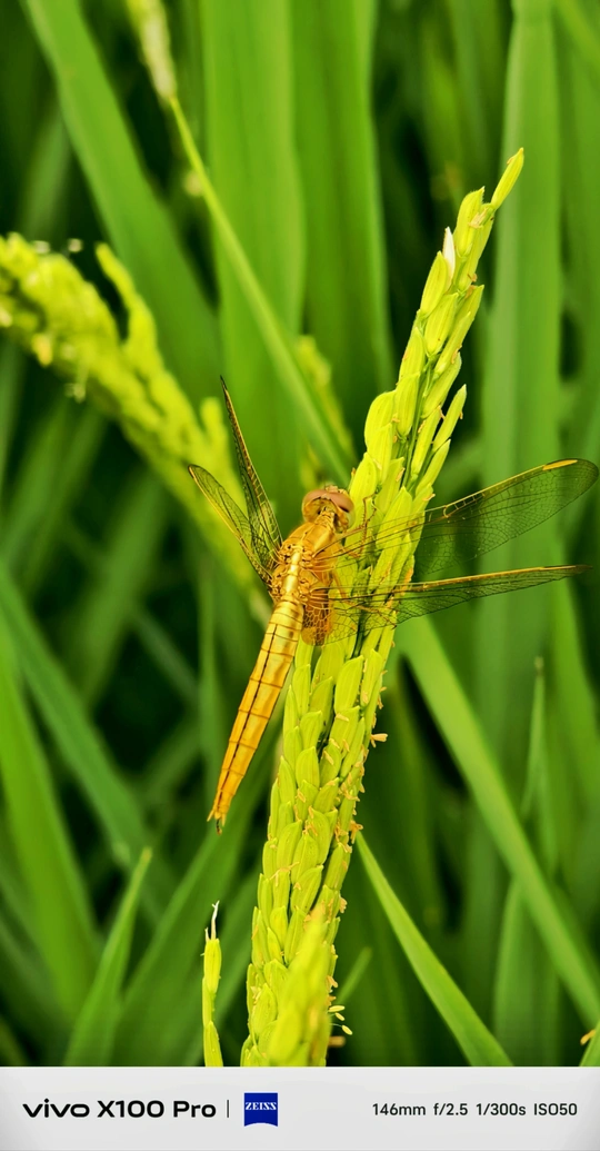 夏日,绿油油的稻田上,一只蜻蜓在谷穗上休憇。