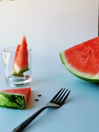 这张照片在色彩和光影处理上表现出色。西瓜的红色与背景的浅色形成强烈的对比,使主体更加突出。透过玻璃的水滴和反光增添了画面的质感,增强了视觉冲击力。构图方面,玻璃杯中的西瓜和叉子的摆放位置巧妙,形成了一条引导视线的线条,引导观者的目光到主要的西瓜块上。背景简洁干净,避免了不必要的干扰,让主体更加突出。 照片的主体清晰,主题明确,成功展示了清凉的夏日氛围,能够迅速引起观者的情感共鸣,唤起夏日饮食的美好回忆。它通过简单而有效的元素传递出一种清新自然的感觉,令人感到愉悦和舒适。 然而,照片可以进一步提升的地方有:首先,可以尝试在背景中加入一些有趣的元素,比如一些模糊的绿色植物或蓝天,可以增加图片的层次感和丰富性。其次,光影的运用上可以更大胆一些,增加一些阴影对比,使得画面更加立体。最后,后期处理上可以稍微增强一些颜色的饱和度,使得水果看起来更为诱人。 总的来说,这张照片具备较高的专业水平,通过简练的构图和强烈的色彩对比,成功地传达了主题,但在背景和光影的处理上还有进一步提升的空间。