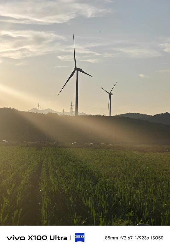 夕阳西下,一束微光洒向姜地,在风车的映衬下,这片葱绿的姜地多了些许暖色,也有了更多层次。