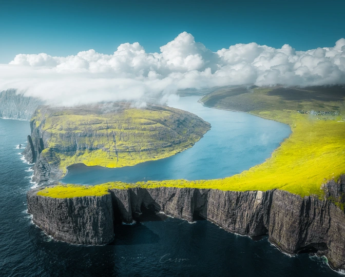 海上悬湖Sorvaags-Vand位于法罗群岛的沃格岛Vágar,因湖水悬空在海上,由此而得名,景观独特震撼。法罗群岛很少大晴天,我们此次来运气很好,拍摄当天刚好是大晴天。周围的悬崖陡峭而宏伟,与湖泊的平静形成了鲜明对比。悬崖顶部的绿色草地向下延展,直至与蓝绿色的湖水相接。湖水如同一面巨大的镜子,天边远处的云朵像一朵大棉花一样。一切都是这么梦幻。PS:尝试糖果色调的后期手法。