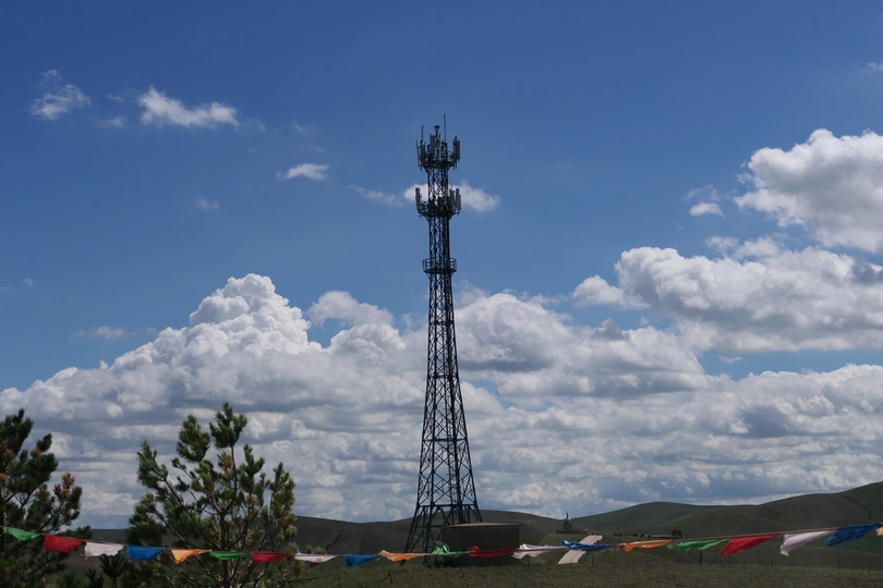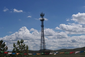 蓝天白云,绿草地,五色的将嘎在随风飘荡,高高的信号塔矗立在原生态的草原。
