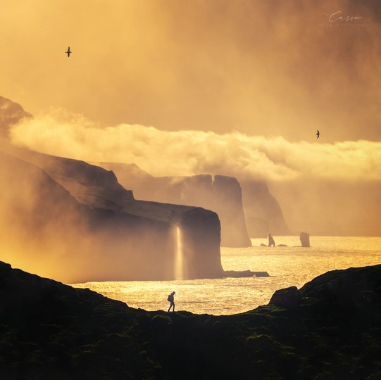在法罗群岛,有一座名为Kalsoy的岛屿。岛屿的最北端屹立着Kallur灯塔,它坐落于三道山脊交汇处,似乎在世界的尽头。这张作品用无人机拍摄了行人在悬崖陡峭小路的场景,他们身后是远处的悬崖瀑布、三座小岛以及Risin og Kellingin礁石。这个场景宛如游戏中的画面,美得不似真实世界,仿佛置身梦境。 Kalsoy是一个独立的岛屿,每一次前往这里并不容易。从Klasvik港口乘坐20分钟的渡轮,然后再驱车17公里,才能到达Trollanes。接下来,还需要徒步40分钟,才能亲眼目睹Kallur灯塔周边的壮美。每次探访这里,都需要耗费大量时间,但每一步都值得。