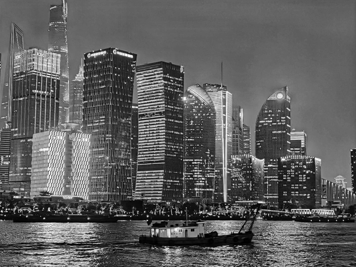 这幅照片展示的是现代上海滩的夜景。面对这灯火辉煌的高楼大厦,照片采用黑白的拍摄手法,运用大厦的灯光在水面的反射光影而增强层次感,打造出了一种神秘而又宁静的氛围,瞬间能把你带入三四十年代熙熙攘攘人声鼎沸的旧上海老码头。滔滔的黄浦江水承载着孤独的小舟,仿佛在向人们倾诉着烟云往事。这,就是黑白调子赋予画面独特的艺术魅力。
