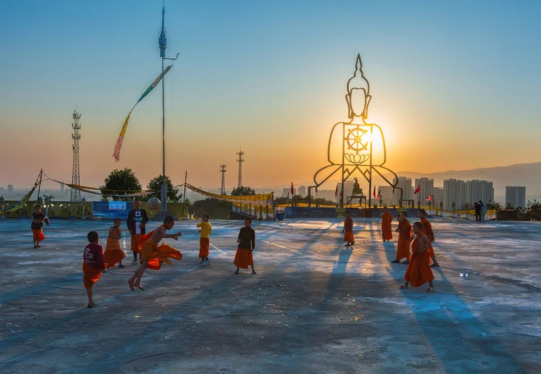 云南瑞丽总佛寺,夕阳下一群小沙弥欢快的踢着足球。