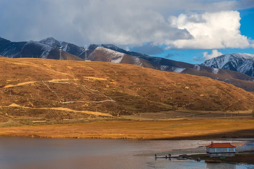 夕阳把山坡和湖水变成一片金黄,几位藏族同胞正在湖边喂食鱼儿,构成一幅美丽的油画