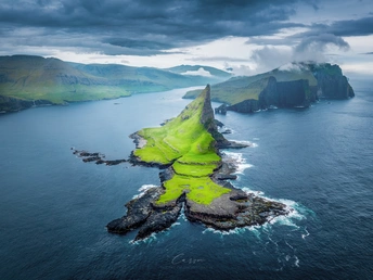 Tindhólmur 是 Vágar 以西的一个小岛。这座小岛无人居住,面积为 650,000 平方米,Tindhólmur 的最高点海拔 262 米。小岛以其崎岖的地形而闻名,拥有高耸的悬崖、深邃的峡湾和丰富多样的动植物。这个美丽、陡峭、多峰的小岛也被当地人称为“睡龙”。
