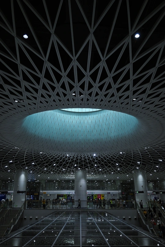 ?景点风光:波澜壮阔的钢结构 ?当地必打卡:深圳必打卡之岗厦北站 岗厦北又名深圳之眼,岗厦北枢纽建筑面积约23.6万平方米,为国内目前最大的轨道交通单体工程。是地铁2、10、11、14四线的换乘站,并通过枢纽南区地下商业区与1号线岗厦站相联通,被誉为“深圳之眼”。岗厦北站中庭设计有无柱大跨钢结构,以核心天井为基点,运用“费马螺旋”数学原理施工天花吊顶,将静态车站和动态列车有机结合,体现了深圳“汇聚、包容、国际化”的文化特征,被誉为“深圳之眼”。
