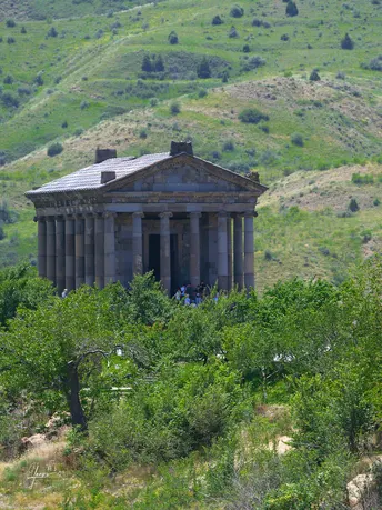 埃里温附近的加尔尼神庙(Garmi Temple) ,它是亚美尼亚境内唯一异教徒神庙。 加尔尼神庙是仿照雅典的巴特农神庙而建的。神庙原来是亚美尼亚国王的夏宫,是希腊文化末期在亚美尼亚文化里唯一存在的遗址。在这里,不仅有庙宇,还有宫殿,甚至有一处浴室。冷水、温水、热水浴池一应俱全,还有蒸汽房,设施相当完备… 人工修葺的痕迹夺走了神庙的沧桑与辉煌。