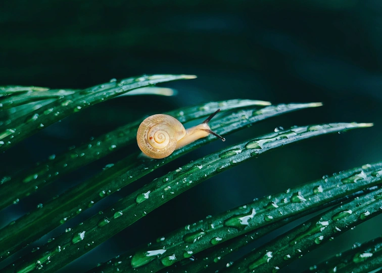 蜗牛匍匐在布满雨水的铁树叶子上。