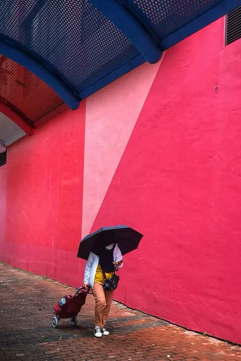 在雨中香港街头鲜艳的小巴站雨棚和墙面中漫步