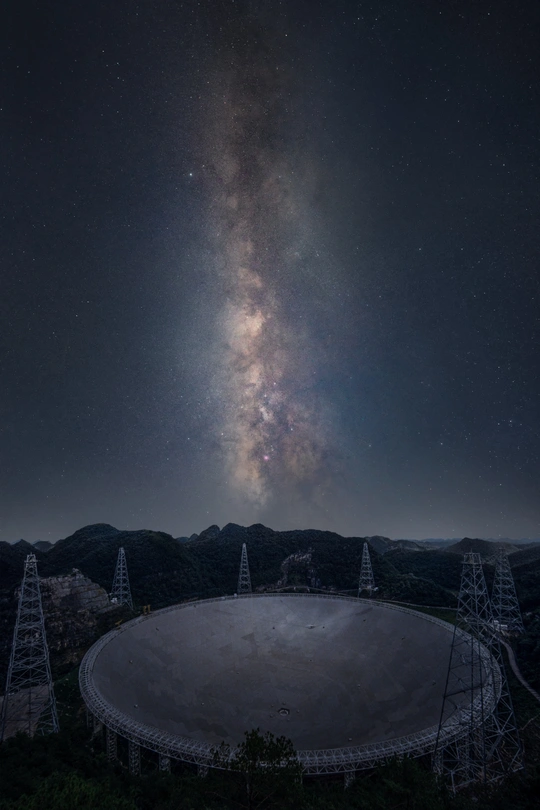 星空创意合成作品,致敬中国天眼FAST之作。 由于进景区不能携带电子设备,地景部分由在景区租用的尼康F3胶片机+尼康1835拍摄,后期冲洗成电子版;星空部分由索尼a7m4+唯卓仕AF16mmF1.8在贵州黔南波尔2级光染区拍摄,10s单张。 因拍摄地景时阴天,建筑物没有影子,所以地景压暗后与夜间的效果相似;在两者拼接之后,又对地平线处做了处理,以模拟实际拍摄效果。