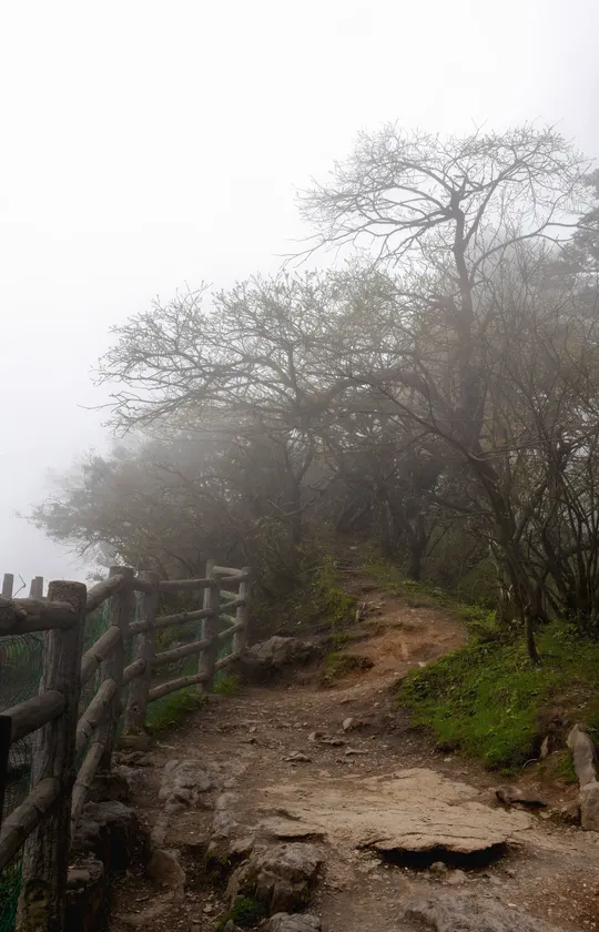 踏上峨眉山的小径,仿若步入了一个神秘的世界。一边是千丈深谷,谷底幽深,似藏着无尽的秘密,令人望而却步,心生敬畏。另一侧是茂林崖壁,陡峭的石壁上,树木顽强地生长,枝叶交错,仿佛在诉说着生命的坚韧。 一条小路蜿蜒而上,宛如一条灵动的蛇,穿梭于山林之间。脚下的石板,承载着岁月的痕迹,每一步都仿佛在与历史对话。 而那一片迷雾,更是给这小径增添了几分神秘的色彩。十步之外,便难以看清,让人仿佛置身于仙境之中。雾气弥漫,湿润了脸庞,也浸润了心灵。在这迷雾中前行,不知前方等待的是怎样的惊喜,亦或是怎样的挑战。