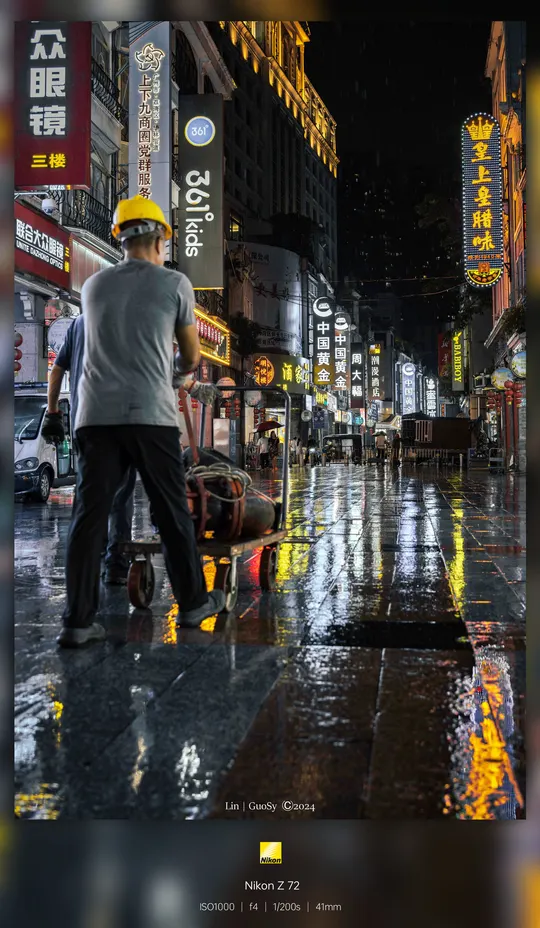 雨夜为城市披上了一层朦胧的面纱,街灯、霓虹灯在雨水的折射下形成斑驳的光影,营造出一种静谧而神秘的氛围。这种氛围能够激发摄影师的创作灵感,捕捉到不同于白天的城市景象。 雨夜扫街人文摄影往往聚焦于人们的日常生活场景,如雨中漫步的情侣、匆匆归家的行人、坚守岗位的劳动者等。这些画面能够引发观者的情感共鸣,感受到雨夜中人与人之间的温情与坚韧
