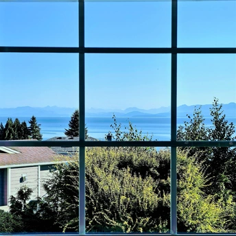 窗外的世界更美丽,不仅有别墅、绿植,还有那起伏的山峦和湛蓝的海水,海天一色,令人心胸更加宽广。