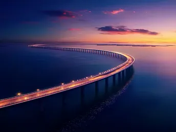 这张照片展现了出色的色彩运用和构图技巧。画面中,夕阳的余晖投射在水面上,形成了温暖的色调,对比了冷色的海面,给人以视觉上的冲击力。曲线形的桥梁在画面中构成了一条引导视线的线条,增强了整体的动感和层次感,吸引观者的目光沿着桥梁移动,欣赏风景的同时也引发了对旅途的联想与思考。 光影的处理上,照片利用了自然光,恰到好处地捕捉了日落时分的柔和光线,为画面增添了一层梦幻的质感。同时,桥上的车灯光轨形成了时间流逝的隐喻,令人感受到生活的匆忙与变化。整体来说,这幅作品在情感共鸣方面表现出色,能引发观者对旅行、人生道路的思考,以及瞬息万变的美好时刻的珍惜。