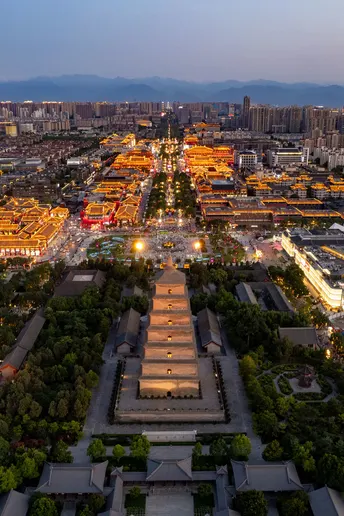 大雁塔位于唐长安城晋昌坊(今陕西省西安市南)的大慈恩寺内,又名“慈恩寺塔”。唐永徽三年(652年),玄奘为保存由天竺经丝绸之路带回长安的经卷佛像主持修建了大雁塔,最初五层,后加盖至九层,再后层数和高度又有数次变更,最后固定为所看到的七层塔身,通高64.517米,底层边长25.5米。 大雁塔作为现存最早、规模最大的唐代四方楼阁式砖塔,是佛塔这种古印度佛寺的建筑形式随佛教传入中原地区,并融入华 夏文化的典型物证,是凝聚了中国古代劳动人民智慧结晶的标志性建筑。