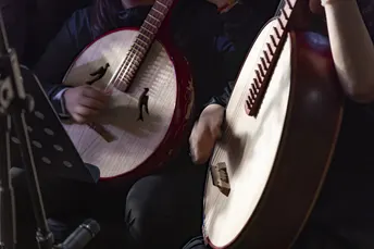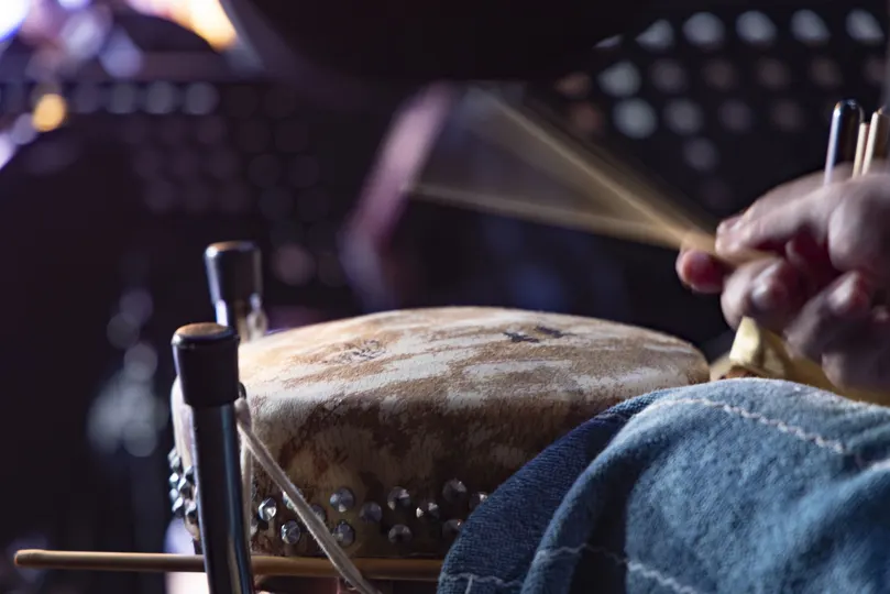月琴和单皮鼓 京剧乐队被称为“场面”。 京剧乐队在京剧表演中扮演着至关重要的角色,它不仅为演员的表演提供伴奏,还通过音乐来营造舞台气氛,交代故事场景,以及点明人物的性格和心态。京剧乐队由管弦乐器和打击乐器组成,根据乐器的不同,可以分为“文场”和“武场”。