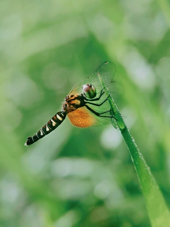 侏小红蜻是世界上最小的蜻蜓,全身鲜红的是雄虫,雌蜻蜓是棕褐色。