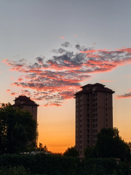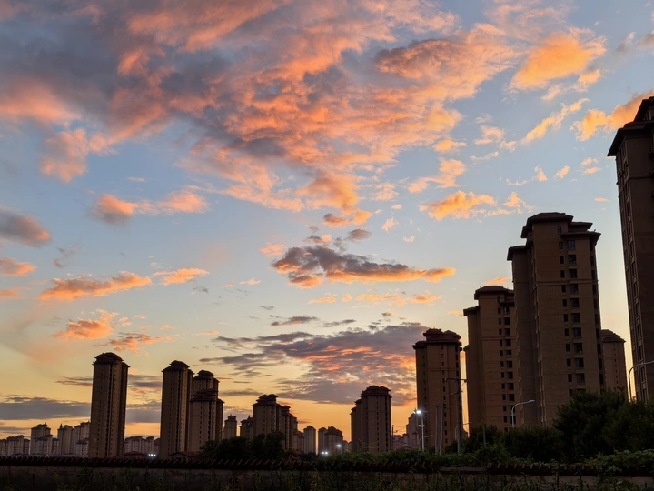 雨后的傍晚,城市上空出现青红色的云霞