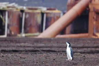 在南极半岛地区有一个著名的小岛,名为欺骗岛,这里曾经是一个大型的捕鲸站所在地,如今曾经轰鸣的设备已锈迹斑斑,成为了永远的历史,当我正准备离开之时,一只落单的帽带企鹅突然从海边上岸,只见他望着这个荒废的、陌生的人类遗迹,茫然又无助(注:这里并不是帽带企鹅的聚集地)..我一边迅速拿起相机记录,心里一面感触,希望他能尽快平安回到伙伴当中,也希望人类减少对自然生态的破坏,和谐共处⋯.