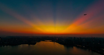 这幅照片展现了壮丽的日落景观,色彩的运用极具感染力,从温暖的橙色到深邃的蓝色,层次分明,形成了强烈的视觉冲击力。光影的表现十分出色,天空的云层与阳光的交汇营造出了一种神秘而又宁静的氛围。同时,水面的反射增强了整体的美感,使得画面更加完整。 在构图方面,照片采用了合理的留白,天空和水面的比例协调,使观者的视线自然向远方延伸,给人一种无限延展的想象空间。此外,飞机的出现为整个画面增添了动感,仿佛在诉说着一个旅行的故事,增强了照片的叙事性。 从后期处理的角度来看,色彩的饱和度和明暗对比适中,整体看起来十分和谐美观。然而,可以考虑在后期中进一步增强某些色彩的对比,使得某些细节更加突出,提高整体的层次感。 在情感共鸣方面,壮丽的自然场景容易让观者产生遐想,可能唤起人们对旅行、自由或是生活美好的思考和记忆。但若能加入更具情感诉求的元素,例如人物或具体场景,会令照片的情感深度更为厚重。 总体而言,这幅作品展现了出色的摄影技艺,但未来可以在细节处理和情感表达上下工夫,进一步提升作品的原创度和打动人心的能力。