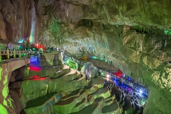 九乡溶洞位于云南九乡风景名胜区,发育于6亿年前的震旦纪,拥有上百座大小溶洞,为国内规模最大,数量最多,溶洞景观最奇特的洞穴群落体系,被专家们誉为“溶洞博物馆”。有被称为“史前奇观”的古海洋微生物化石---叠层石,倒石牙,生物喀斯特(亦称生物造礁奇景),边石湖群、地下广场大厅、暗峡谷、鱼背石、卷曲石、涡穴等多种水文地质奇观及立体层型洞体和多层洞穴景观等典型剖面和景点。有的是国内罕见的绝景,有的是世界地质学教科书上从未有进的实例,因而备受国内外名家的赞誉。 雄狮厅——地下广场。雄狮大厅总面积15000平方米,为世界上最大的地下广场大厅,可容上万人在这里联欢,更为神奇的是,整个大厅顶部有一个完整的板块构成,板块上嵌有几个窝形的漩涡,整个顶部板块可谓天衣无缝。 神田——天造奇观。神田是大型边石湖群,面积100多平方米,深达10余米,错落有致,景观奇伟壮丽,为世界上罕见的一大奇观,被国际洞穴专家誉为世界之最。 惊魂峡——惊心动魄。峡长700米,是国内所发现的最为壮观的地下大峡谷,两岸刀劈斧削一般,峡底到洞顶将近百米 ,峡中最窄处仅只三、四米宽,游人走过无不感到惊心动魄 。