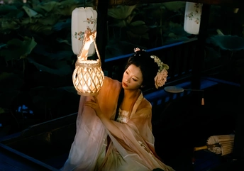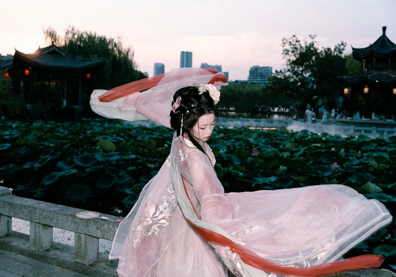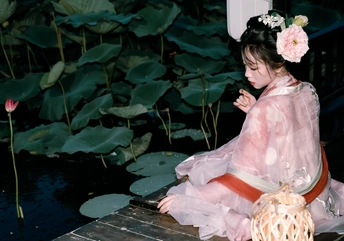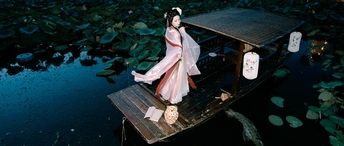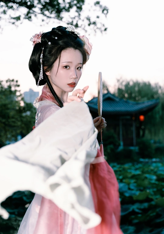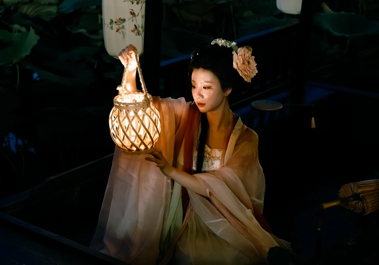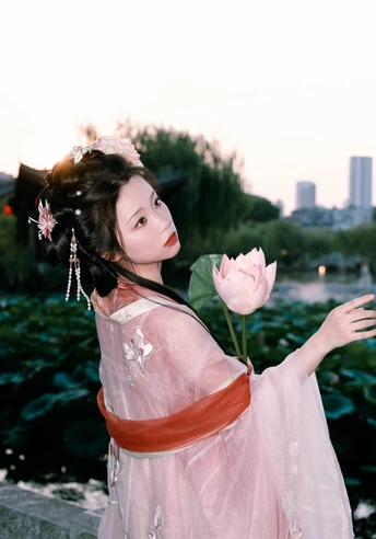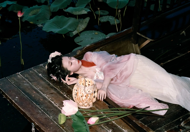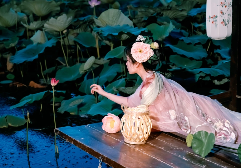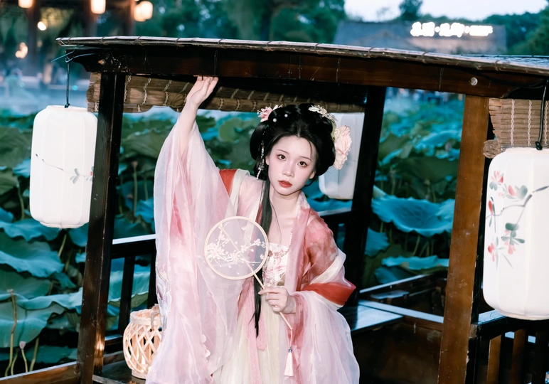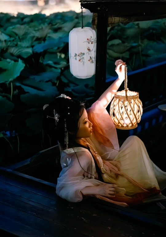 粉黛轻拂曳地,玉腰轻束,花饰云鬓。舟头独立凝望,荷香轻送,夜色如水。月华洒落清辉,映佳人、温柔如水。此景美、难描难画,只道人间无此丽。 风拂柳丝轻舞起,碧波荡漾心难定。遥想往事如烟,终化作、相思泪滴。欲寄情思,却怕、离愁别绪难理。愿此刻、长留永驻,不负韶华意。