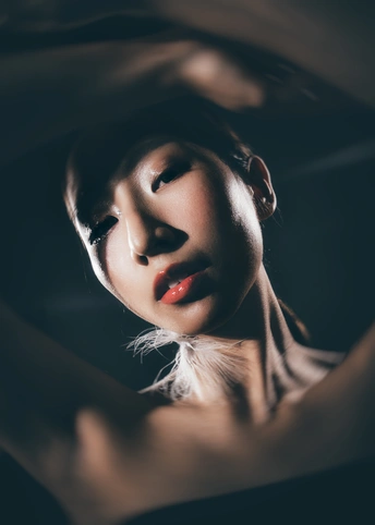 模特的面部特征和神态被巧妙地融入了形状中,形成了一个封闭的框架,使得整体画面更具层次感和立体感。这样的构图使观者的视线自然而然地集中在模特的面容及表情上,增强了视觉冲击力。 在光影方面,运用柔和的侧光和阴影丰富了面部的表现,突显了模特肌肤的细腻质感,同时也塑造了神秘而优雅的氛围。光线的运用是这张照片的一个亮点,通过明暗对比,增强了情感的张力,使得模特的神情更显复杂与深邃。 色彩方面,选择了相对暗淡的背景,与模特鲜亮的红唇形成对比,强化了视觉的吸引力。背景的模糊处理也为主体提供了良好的衬托,使得照片的焦点更为突出。 模特:UU 妆容:知了