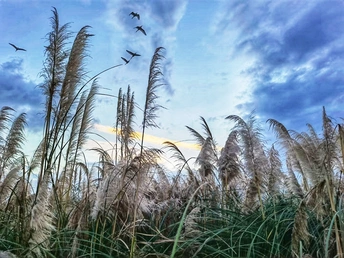云彩变幻的蓝天、夕阳的余晖、米色的芦苇、向往自由的翱翔飞鸟,整个画面色调和谐、动静结合,让人产生淡淡的思乡之情……