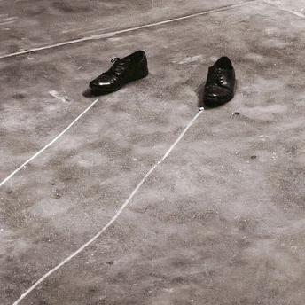 拍于景德镇陶溪川的一场行为艺术中,空地上一双旧皮鞋,分别压在一根粉笔线上,提示出鞋与路的意向,可以引发观者的想象与臆测。