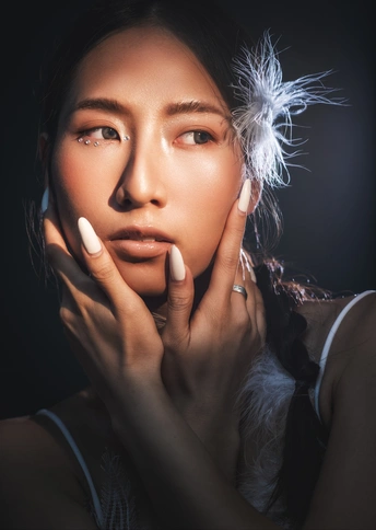 在光影的运用上,利用了柔和的光源和阴影的对比,营造出了一种梦幻而又神秘的氛围。模特的表情细腻,眼神中透着深邃,从而引发观者的情感共鸣。 在色彩方面,整体色调偏向于温暖的肤色与冷色调的背景形成鲜明对比,提升了作品的层次感。模特脸部的光线处理恰到好处,突出了她的五官与妆容。 出镜:UU 妆容:知了