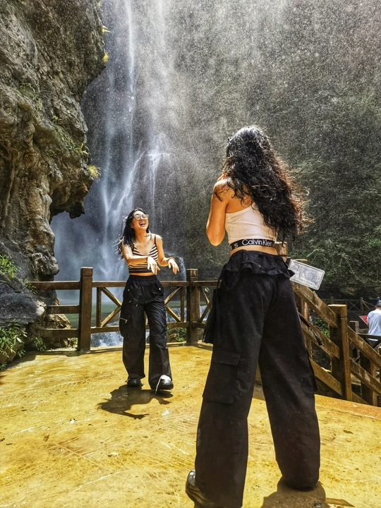这张照片展现了一个生动而快乐的场景,两位女主在瀑布前的欢快嬉闹,展示了人与自然的和谐美感。