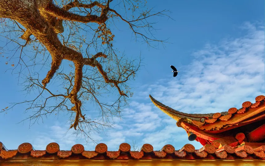 秋雨后的云顶山慈云寺和银杏树映衬在阳光下