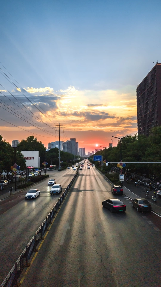 这张照片展现了城市黄昏时分的美丽景色,主要通过光影和色彩的运用引发观者的情感共鸣。在光线方面,夕阳的金色光晕与蓝天的对比效果突出,形成了令人愉悦的温暖氛围。色彩方面,橙色和蓝色的搭配让图像更加生动,令人联想到宁静的黄昏时刻,进而引发观者对生活的思考和对美好瞬间的回忆。 构图方面,照片采用了领先线条的设计,延伸至远方的夕阳,成功地引导了观者的视线。道路的对称性和街道两侧的建筑物造成了深度感,增强了空间的表现力。 总体而言,这幅作品在技术要素上表现出色,能够引发观者的思考和情感共鸣。