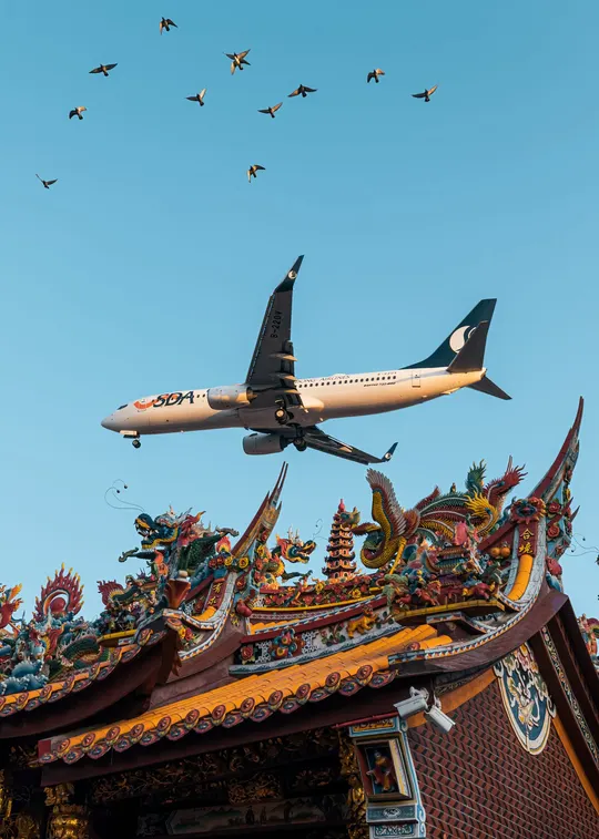 当飞机低飞抚过庙宇的时候,歇息在庙顶的鸽群也受到了惊吓四处飞散,不由的思考是飞机打破了宁静和谐的景象,亦或是鸟群成了不速之客