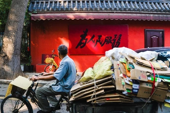 这幅照片通过色彩、构图及光影的运用,成功地传达了主题的情感深度。照片中的红色墙面为图片增添了鲜明的视觉冲击力,搭配骑行者身后的纸箱堆,形成了鲜明的对比,突出了生活的艰辛与坚韧。光线柔和,但足够突出主要元素,使得观者的视线自然而然地被引导到骑行者和他所运载的物品上。 在构图方面,摄影师巧妙地利用了前景和背景的层次感,骑行者成为了画面的主体,背景的红色墙面与远处单车形成了呼应,营造了一种深邃的空间感,丰富了整个画面的故事性。在情感共鸣上,这幅作品引发了观者对社会底层人群的关注和思考,展现了一种平凡而坚韧的生活状态,使得人们不禁对骑行者的经历产生共鸣。 在原创性方面,此作品虽不乏常见的街头摄影元素,但通过颜色的运用和细节的聚焦,赋予了其独特的视角与情感深度。