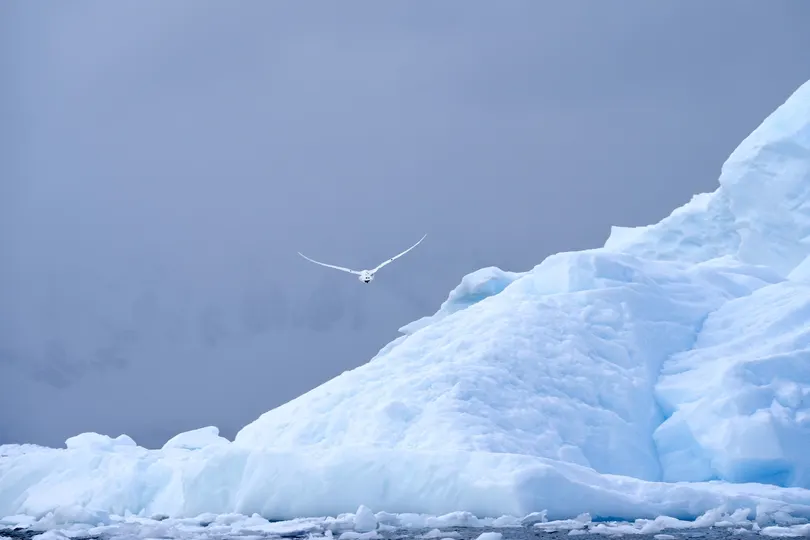 蓝白色的冰面在阴沉的天空下显得格外醒目。冰山的表面呈现出崎岖不平的纹理,显示了冰层的厚重与冷冽。在冰山上方,一只鸟正在展翅飞翔,为这个静谧的冰川场景增添了一丝生命的活力。背景的天空呈现出灰蓝色,云层低垂,整体氛围冷峻、静谧,体现了极地的孤寂之美。