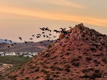 九月初的墨西哥洛斯卡沃斯,气温虽然较最炎热时有所下降,但仍然保持在25-33度之间。傍晚时分,夕阳缓缓西下,一群大雁恰好从太平洋海边,向市区飞去,形成一道非常难得的“落霞与大雁齐飞”之景观。