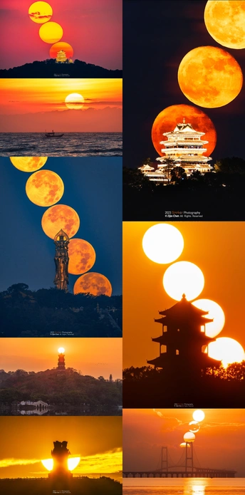 p2惠州挂榜阁月出 p3莲花山望海观音月落 p4深中通道日出 p5惠阳凤凰阁日落 p6汕尾五面观音日落 p7惠州挂榜阁日落 p8海上日出 p9惠州泗洲塔日落