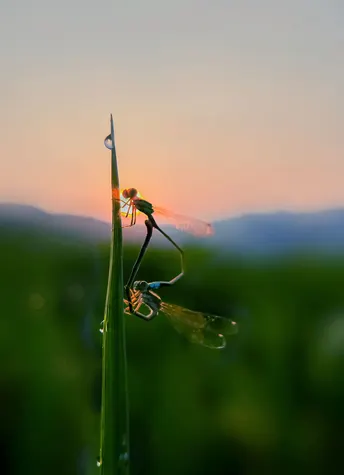清晨,一对豆娘在清晨阳光的抚慰下,为繁衍后代忘情地投入到运动中。我降低身子,把豆娘的头部对准在太阳,逆光拍下了这一幕。