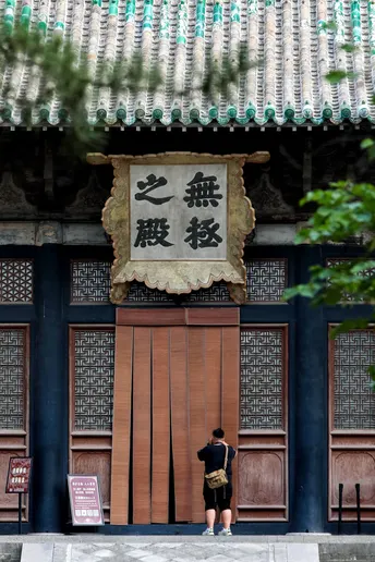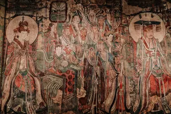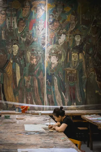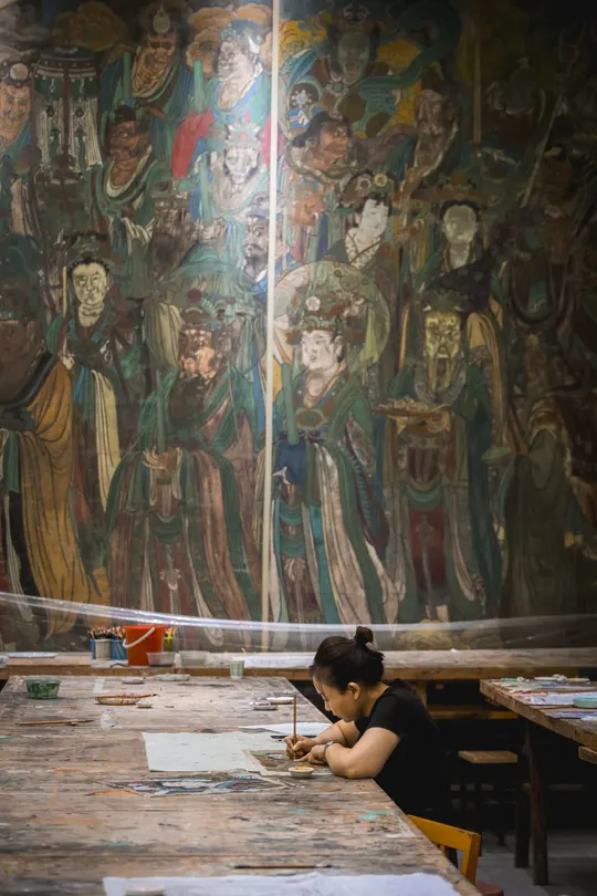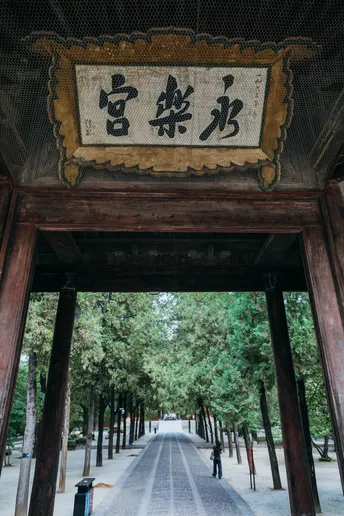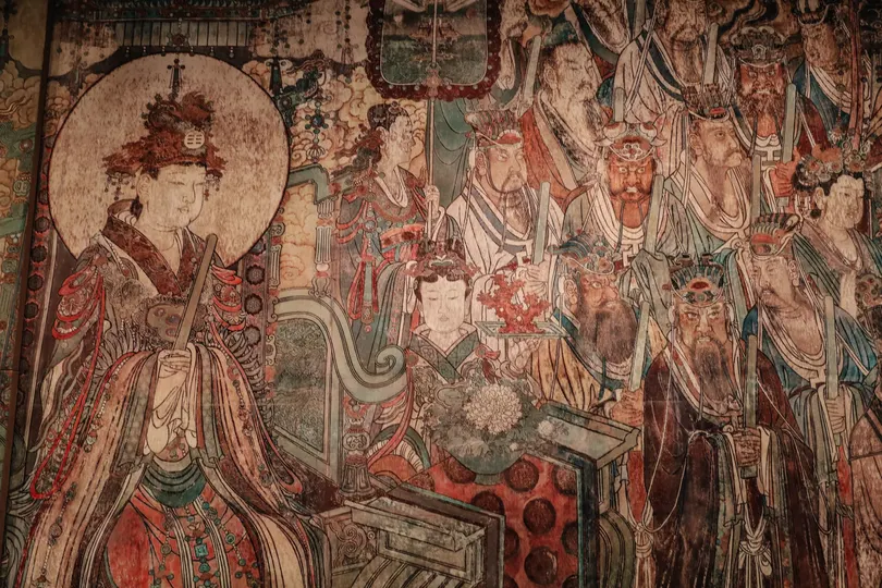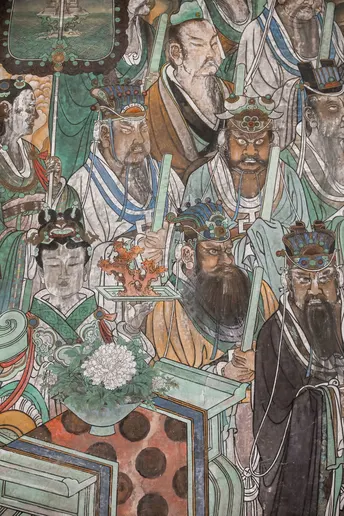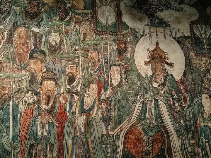 山西行。位于运城市芮城县的永乐宫。芮城永乐宫°,原名大纯阳万寿宫,位于山西省&运城市Q芮城县北约三公里处的龙泉村东,是中国现存最大、保存最为完整的道教宫观之一。永乐宫是为纪念吕洞宾°而修建的一座道教宫观,其元代壁画是世界现存的古代壁画艺术宝库之一。永乐宫的壁画总面积达960平方米,其中《朝元图》描绘了群仙朝元始天尊的场景,展现了290位神仙。ps:永乐宫壁画太珍贵,绝对不要拍照,可以先去运城博物馆先拍永乐宫高清复刻𤩹画和人像,再去永乐宫看真实的𤩹画,听讲解。
