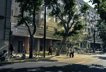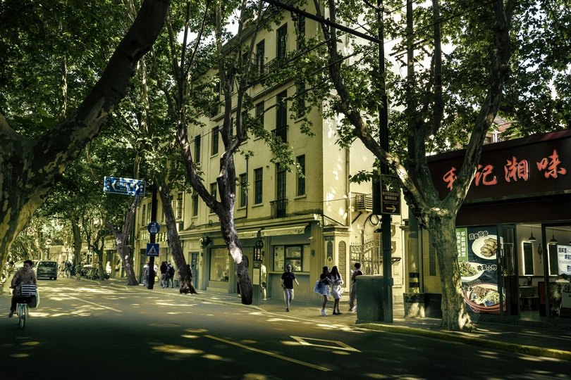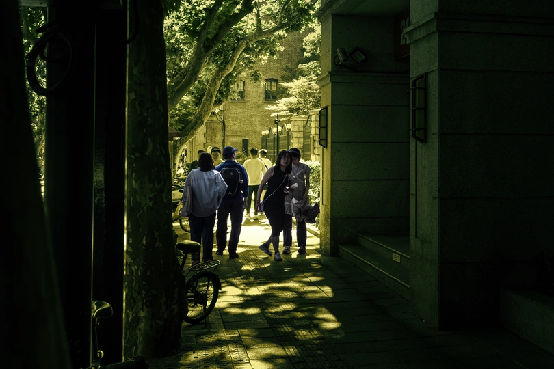 上海街头树、人、建筑的层次 —————() 人过形影留, 根扎树不走。 风过枝叶稀, 街名已百秋。 愚园百年久, 物穰居住稠。 名人占一半, 建筑居人楼。 上海,拍摄街道,季节是关键,不同的时间不同的味道,夏拍树荫,冬拍树,有情趣,斜光会把人、树、建筑分出层次。有一些网站说拍摄时减一点树好!自己喜欢在繁杂的街景中,寻找它们的层次,寻找区分层次的拍摄方法,钻牛角尖了吧?用黄色调子拍摄它们吧。(相机预设拍摄)